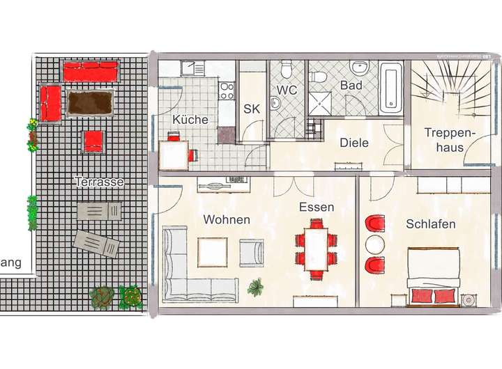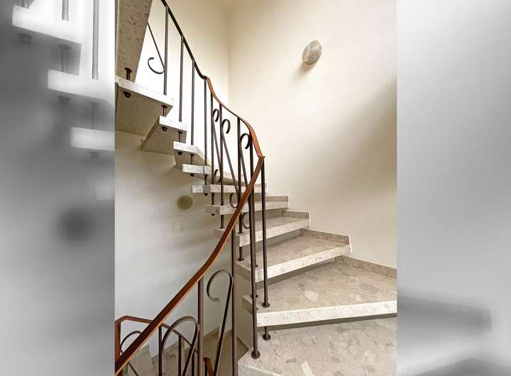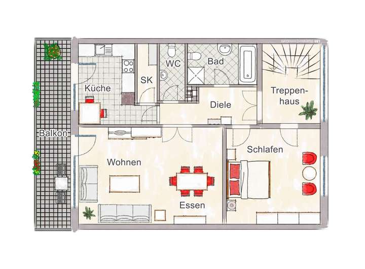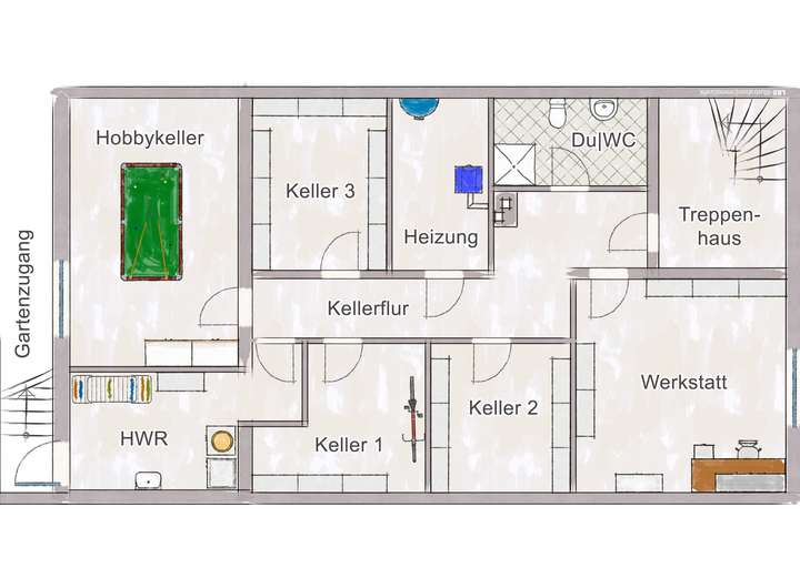 Das vorgelagerte Treppenhaus erschließt die beiden Wohneinheiten und den Vollkeller. Beide Wohnungen verfügen über ein Vollbad und ein Gäste-WC. Je nach Nachnutzung sind hier Veränderungen möglich. Fenster, Haustür, Heizung und weitere Einzelmaßnahmen können ggf. durch die BAFA gefördert werden.