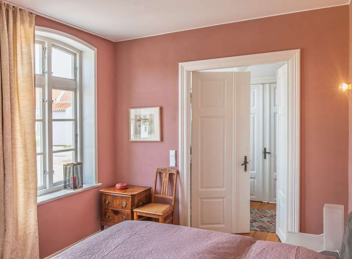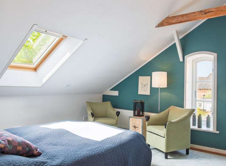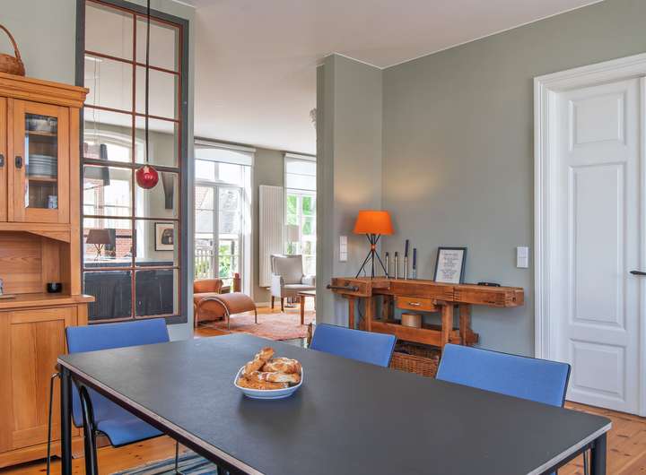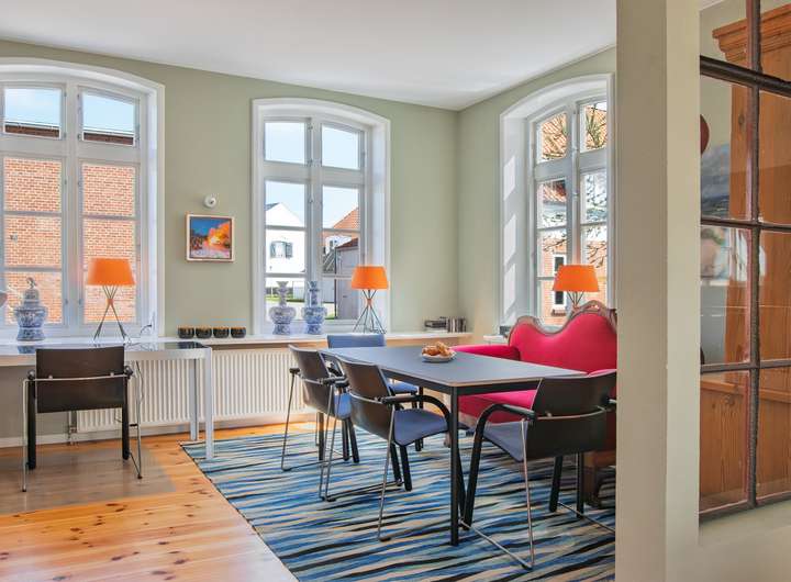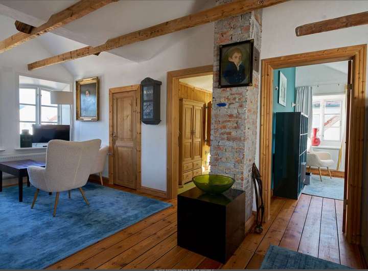 Die Wohneinheit im Erdgeschoss besticht durch eine helle und offene Raumgestaltung mit circa 3,20 Meter Deckenhöhe und symmetrisch angeordneten Fenstern, welche den Koch- und Wohnbereich mit natürlichem Licht erfüllen. Die offene Küche kombiniert moderne Funktionalität mit historischem Charme, während der Kachelofen für wohlige Wärme in der kalten Jahreszeit sorgt. Dazu kommen ein Schlafzimmer mit Blick auf die Højer Mühle und ein modernes Bad mit Sauna. Der gerade neu geschaffene Wintergarten rundet das Platzangebot im Erdgeschoss ab.