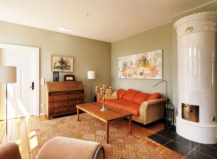 — Heller Wohnbereich mit Kachelofen und Gartenblick