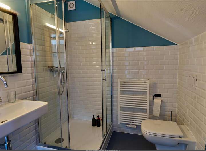 Im Obergeschoss bietet sich Flexibilität – z.B. private Nutzung, B&B, Büro oder Beratung. Vom zentralen Wohnbereich mit offener Kochgelegenheit gelangen Sie in drei helle Schlafzimmer. Zwei moderne Bäder, eines davon en-Suite, komplettieren die obere Wohneinheit.