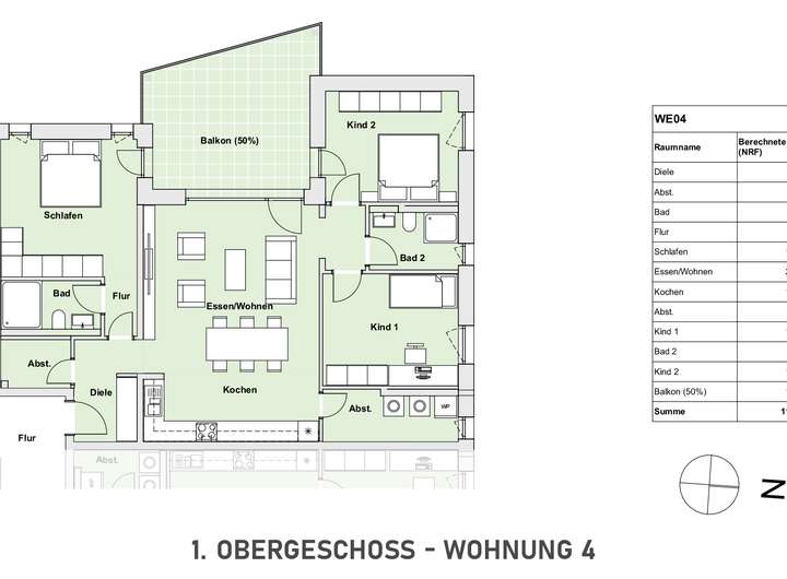 Diese Wohnung bietet Großzügigkeit und Wohnqualität auf hohem Niveau: Die WHG. 04 im 1. Obergeschoss umfasst ca. 117,17 m² und 4 Zimmer – perfekt für alle, die Wert auf Platz, Komfort und eine moderne Planung legen. Die offenen Bereiche und die großen Fensterflächen schaffen ein helles, angenehmes Wohngefühl. Der Balkon ergänzt das Zuhause um eine attraktive Rückzugsmöglichkeit im Freien.