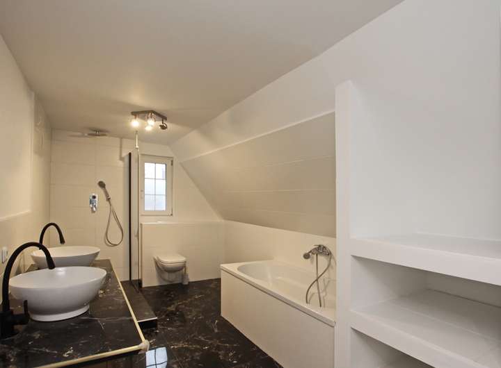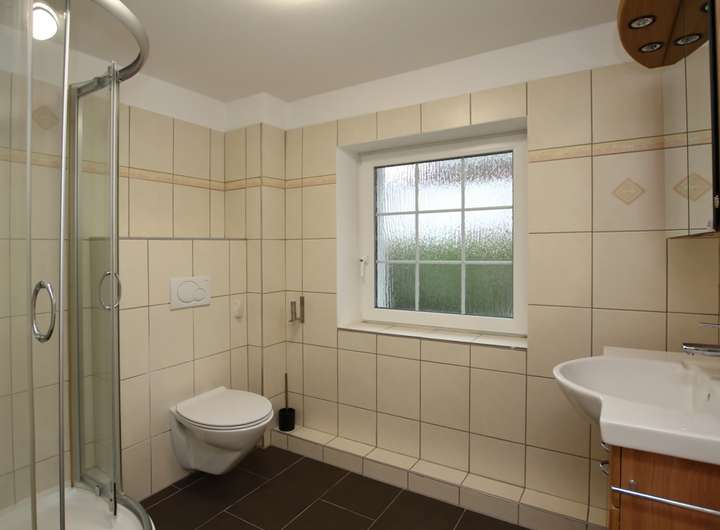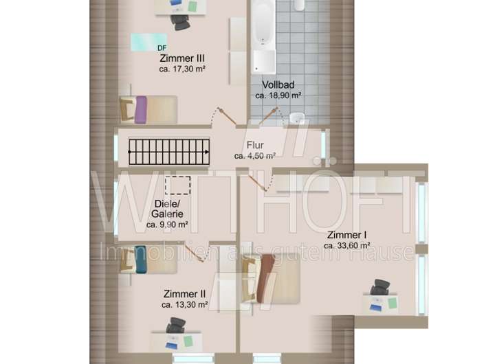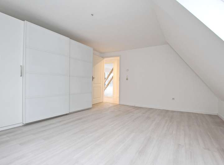Über ein elegante, offene Treppe lässt sich das Obergeschoss erreichen. Hier befinden sich ein großes Vollbad mit Doppelwaschtisch, eine weitere Diele und insgesamt drei Schlafbereiche in wirklich ansprechender Größe.