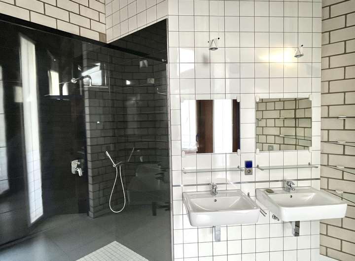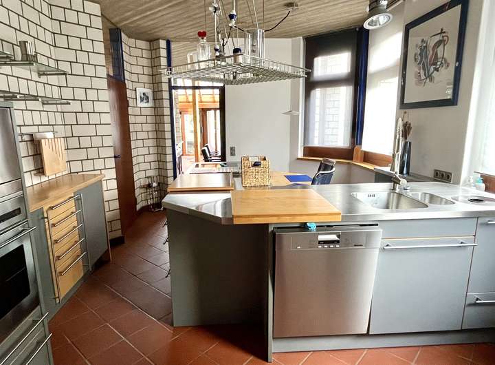 Fliesen, Fußbodenheizung, Kaminofen, hochwertige Einbauküche, Boden-gleiche Walk-in Dusche
