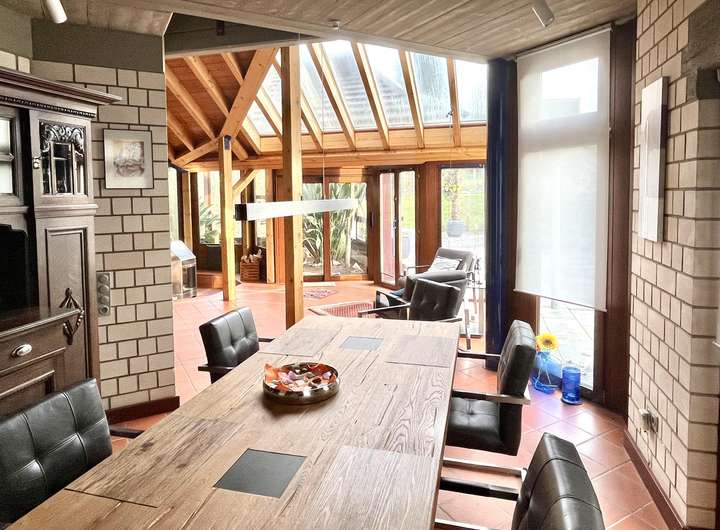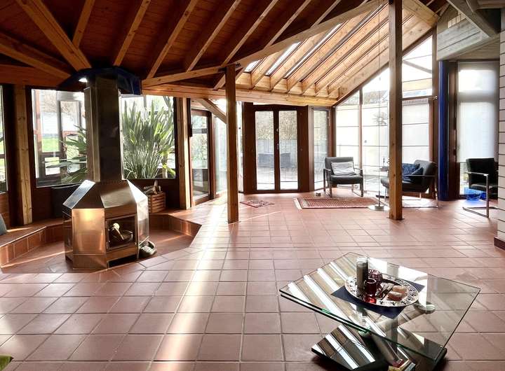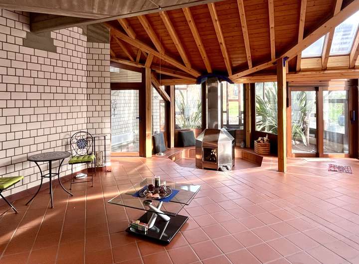 Wohn-Ess-Kaminzimmer, Wintergarten, Terrasse, Küche, Hauswirtschaft, Diele, Garderobe, Gäste-WC
