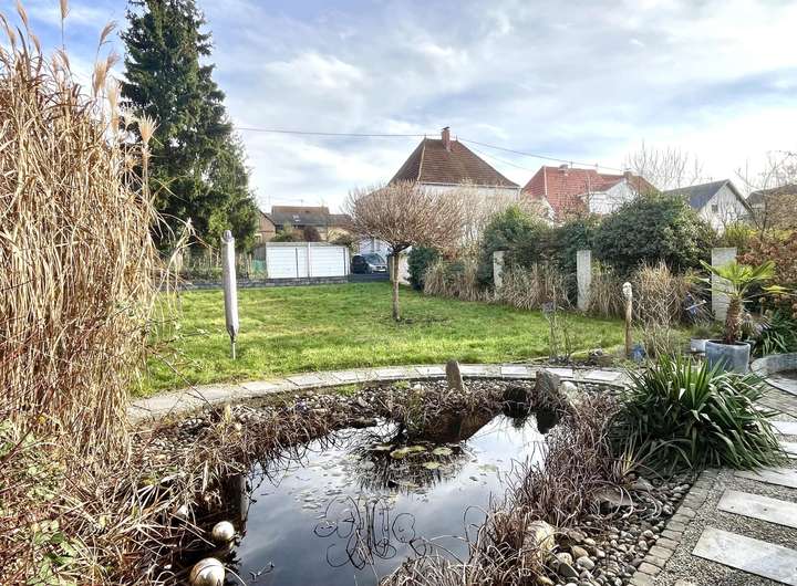 720 m² Areal, fast ebenes Gelände, gepflegter Garten mit großer Terrasse und Gartenteich in angenehmer Sonnenlage
