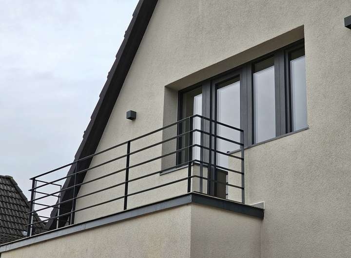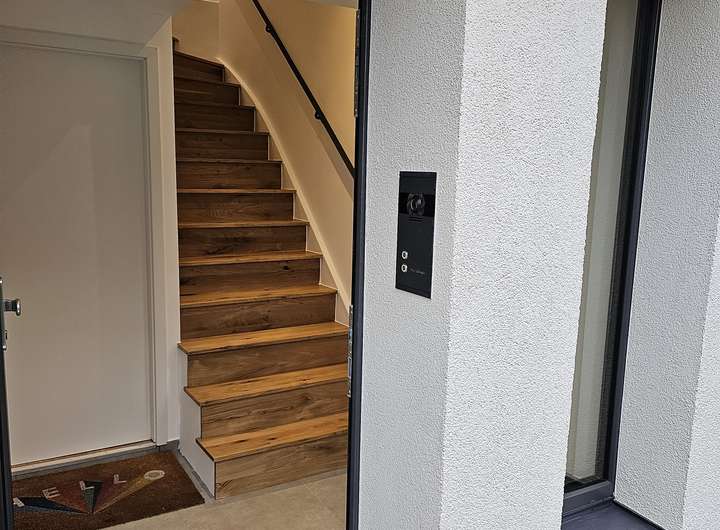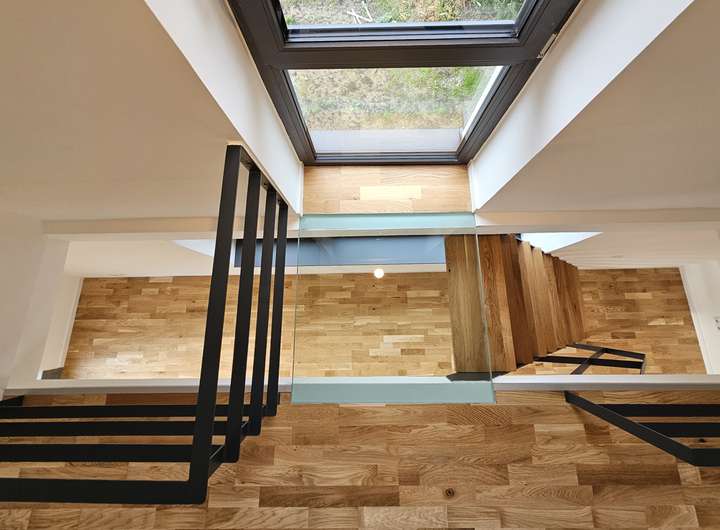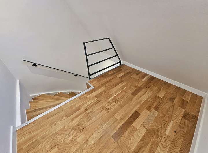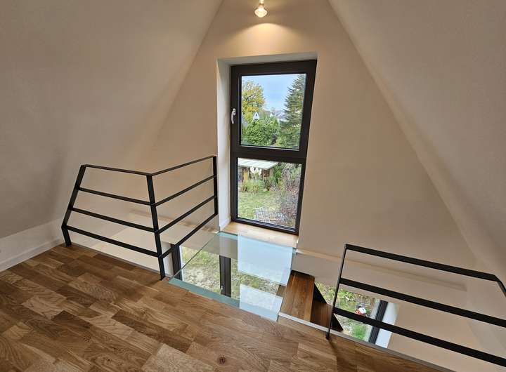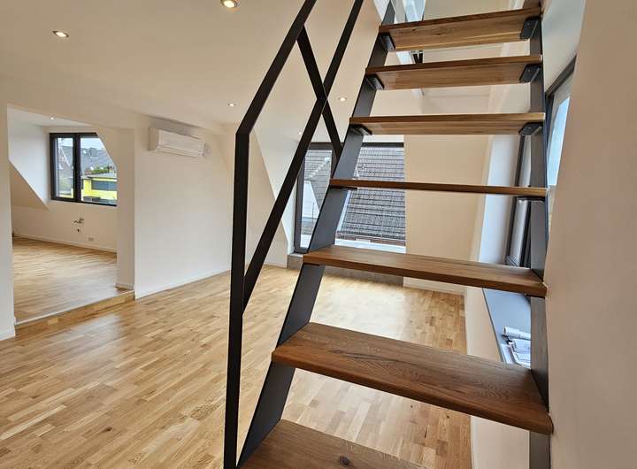 Maßgefertigte Schlosserdetails wie Geländer und Treppen wurden exklusiv für diese Wohnung entworfen. Die Galerietreppen sind mit massiven Eichenholzstufen ausgestattet und öffnen beispielsweise über dem Wohnzimmer einen weiteren hellen Raum. Die letzte Stufe der Treppe bildet eine Panzerglasscheibe aus Verbundsicherheitsglas, die dem Wohnbereich ein noch freieres undroßzügigeres Wohngefühl verleiht. Auch das Bad ist über eine Dusche mit satiniertem Glas mit dem Wohnraum verbunden. Eine großzügige Dachterrasse bietet ausreichend Platz für Tische, Stühle, Outdoor-Lounge und Gartenpflanzen. Zum Schlafzimmer gehört ein kleiner Balkon, der morgens viel Licht in den Raum lässt. Im Sommer kann die Klimaanlage im Wohnzimmer genutzt werden. Zusätzlich gibt es elektrische Außenjalousien zur Hauptsonnenseite, die auch über die Wochenprogrammierung am Controller bedient werden können.