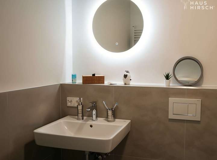 - modernes neu saniertes gefliestes Badzimmer mit Dusche und beleuchtetem Spiegel über dem Waschbecken