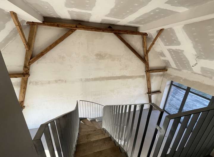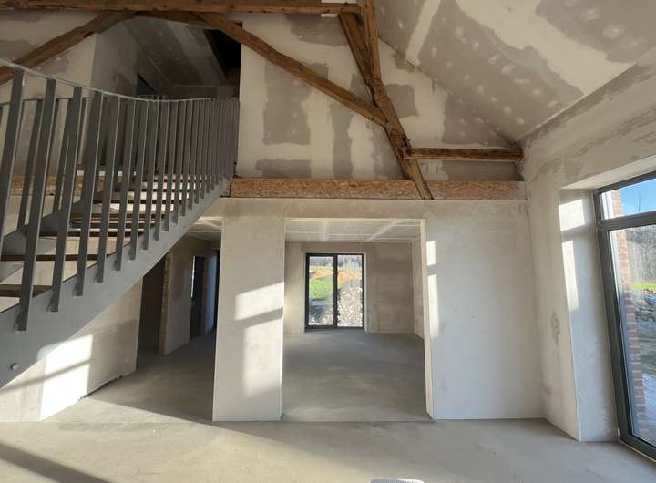 Auf einem Hof außerhalb von Heiden wurde eine Scheune mit viel Liebe zum Detail in zwei exklusive Wohneinheiten umgebaut. Durch vollverglaste ehemalige Scheunentore strömt Tageslicht in die großzügigen Wohnräume und schafft eine helle und freundliche Atmosphäre. Sichtbare alte Holzbalken verleihen dem modernen Ausbau einen authentischen, rustikalen Charme. Der offen gestaltete Küchen- und Essbereich beeindruckt zudem mit einem rund 5,80 Meter hohen Galerieraum, der dem Wohnen eine besondere Großzügigkeit verleiht.