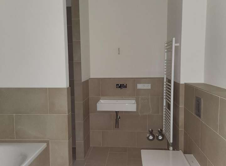 Das moderne Badezimmer lässt keine Wünsche offen: Hier erwarten Sie eine bodentiefe Dusche und eine separate Badewanne für entspannte Momente. Eine Bad mit Waschmaschinenanschluss bietet zusätzlichen Stauraum innerhalb der Wohnung.
