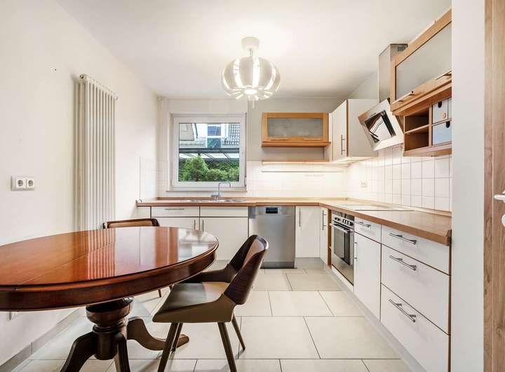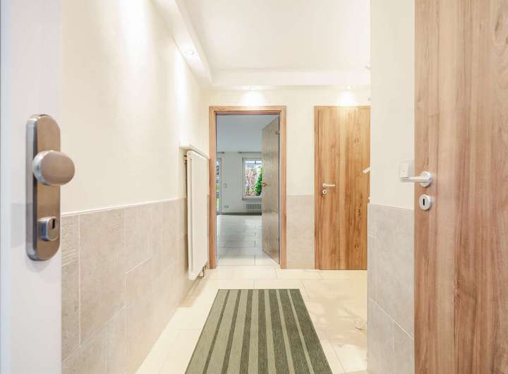Beim Betreten des Hauses empfängt Sie ein gut geschnittener Eingangsbereich mit direktem Zugang zum Gästebadezimmer. Das Erdgeschoss besticht zudem durch einen sehr großzügigen Wohnbereich mit integriertem Essbereich und offener Küche. Eine großflächige verglaste Flügeltür führt direkt auf die Terrasse und eröffnet einen wunderschönen Blick in den Garten. Gleichzeitig sorgt sie für eine besonders helle und freundliche Wohnatmosphäre.