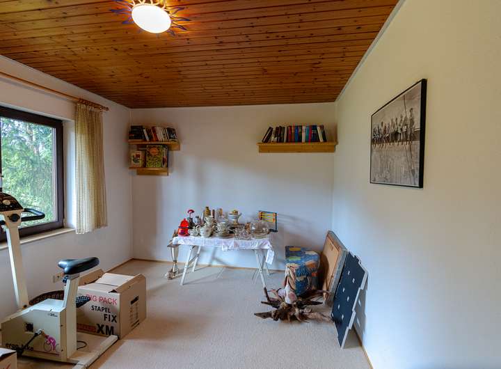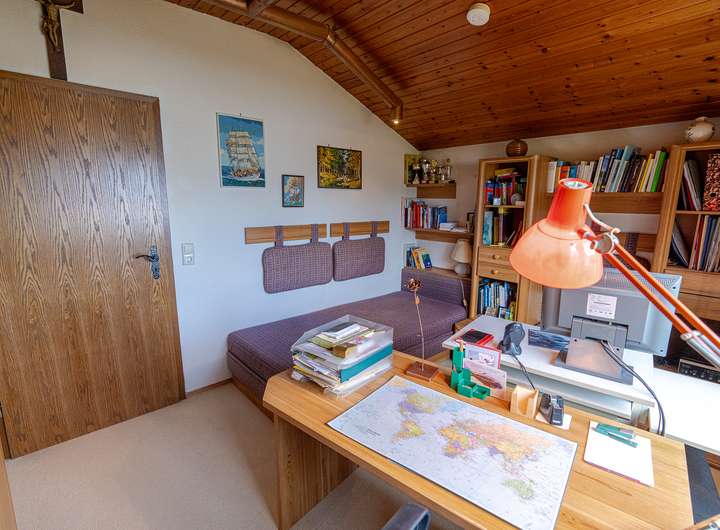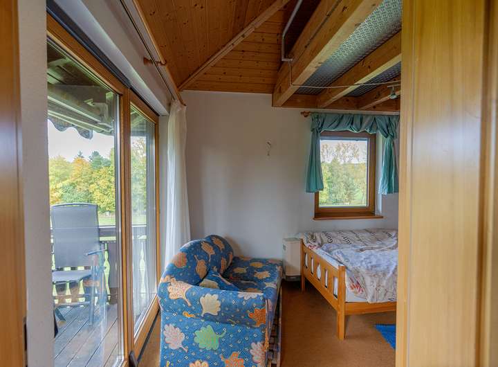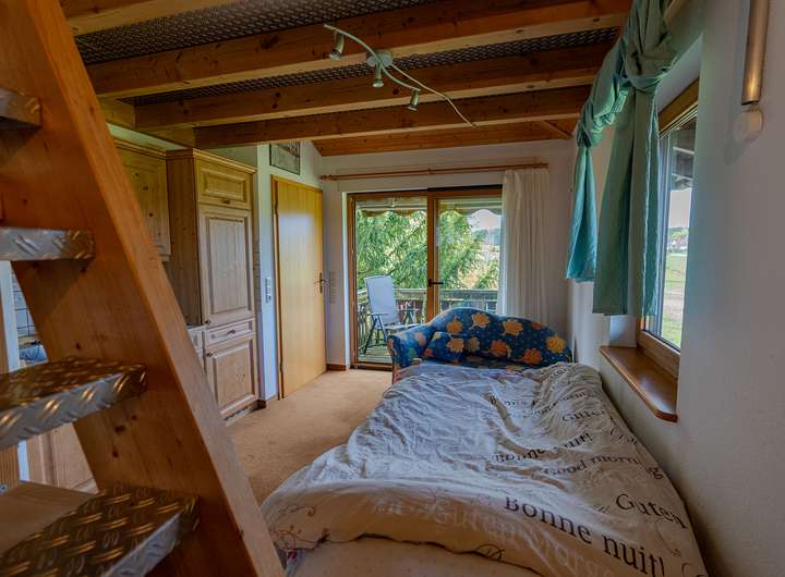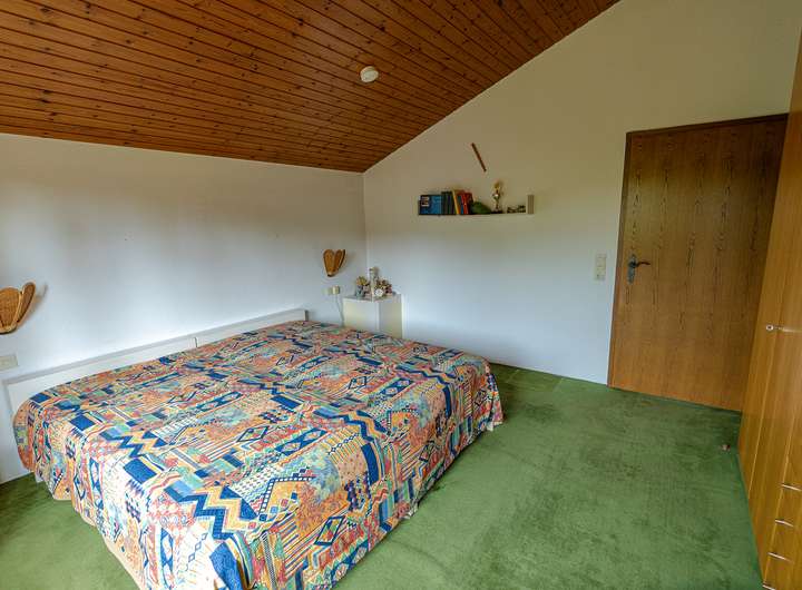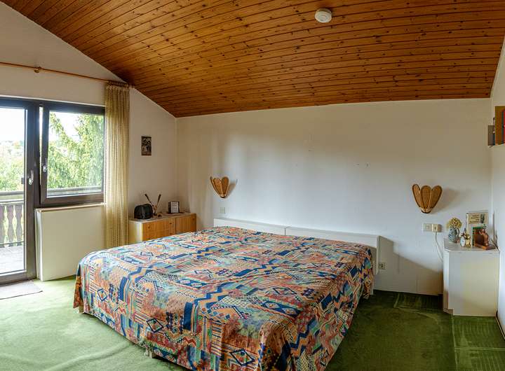 In der nächsten Wohnebene erwarten Sie das Schlafzimmer, ein weiteres Zimmer sowie ein Badezimmer. Vom Balkon aus haben Sie einen wunderbaren Blick in den Garten und auf die angrenzenden Wiesen – ein perfekter Ort, um den Tag entspannt ausklingen zu lassen.