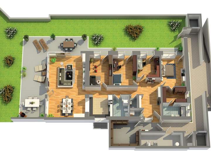 Wohnen, Garten, Terrasse - alles auf einer Ebene Der offen gestaltete Wohn- und Essbereich mit rund 50 m² bildet das Herzstück der Wohnung. Große Glaselemente öffnen den Raum zur ca. 80 m² großen Terrasse und in den privaten, pflegeleichten Garten. Innen und außen gehen hier fließend ineinander über - ohne Stufen, ohne Barrieren.