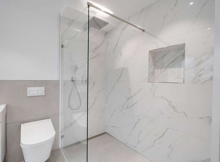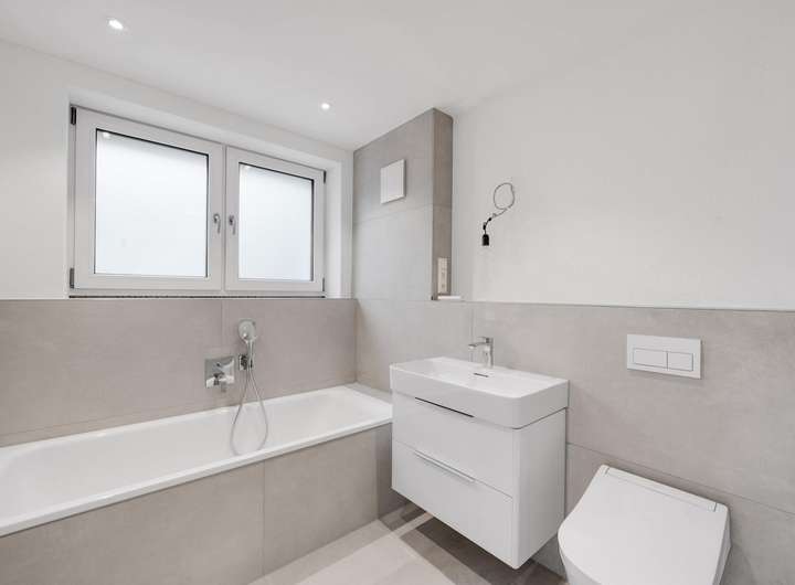 Sanitär-Luxus: Masterbad mit Walk-In-Dusche, Wanne & Premium-Dusch-WC (Washlet).