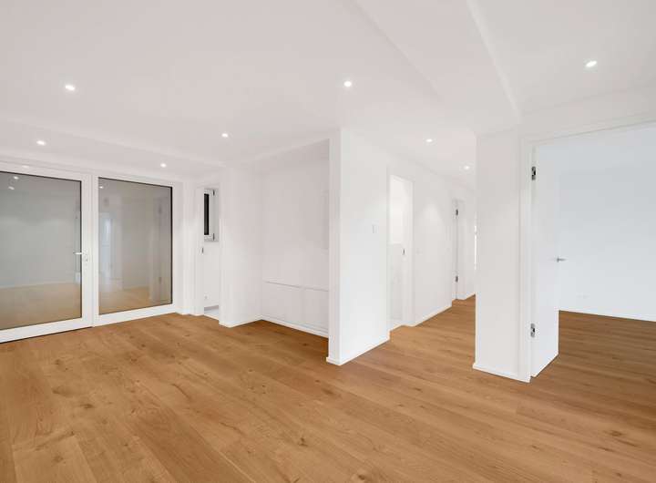 Böden: Edle Massivholz-Landhausdielen (22 mm Eiche), vollflächig verklebt für optimalen Schallschutz.