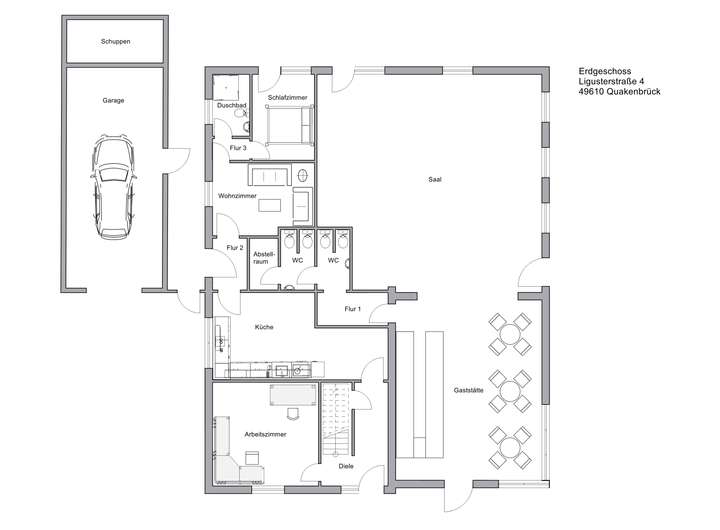 Im rechten Bereich des Erdgeschosses befinden sich die Räumlichkeiten der ehemaligen Gaststätte.