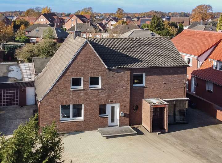 Dieses Wohnhaus mit ehemaliger Gaststätte präsentiert sich als großzügiges und solide errichtetes Gebäude mit Verblendmauerwerk aus roten Ziegeln . Das zweigeschossige Haupthaus mit Satteldach wird durch einen rückwärtigen, eingeschossigen Anbau ergänzt, der die Wohn- und Nutzflächen sinnvoll erweitert und dem Objekt einen vielseitigen Charakter verleiht.
