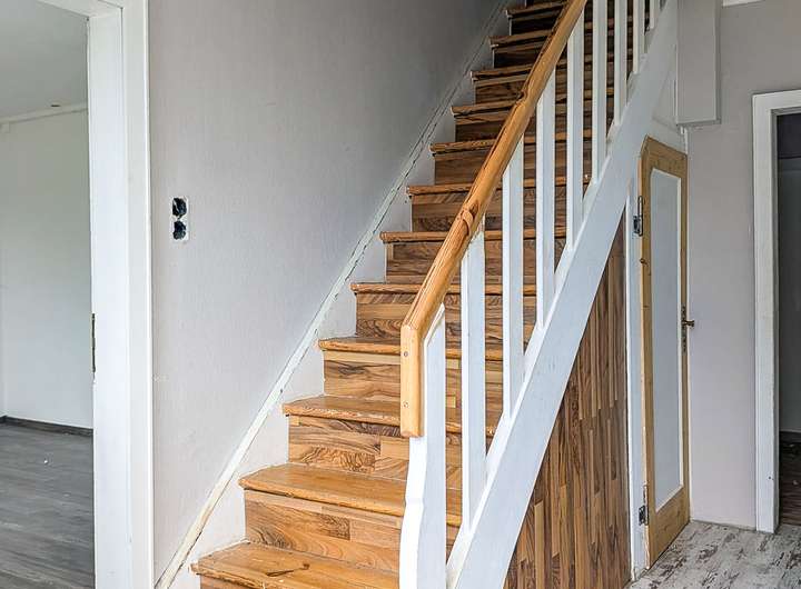 Über die Diele gelangt man sowohl zur Treppe ins Dachgeschoss als auch in den Keller. Am Ende öffnet sich der Bereich zur geräumigen Küche, die in den Flur des Nebeneingangs übergeht. Dieser ermöglicht einen direkten Zugang zur angrenzenden Garage und sorgt für kurze Wege im Alltag.