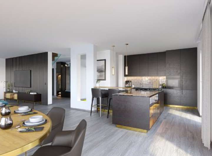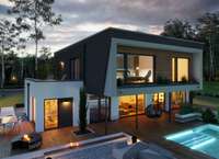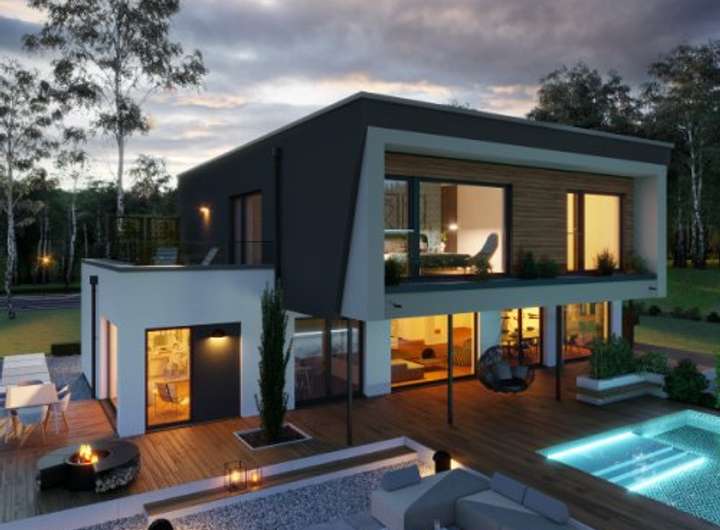Das projektierte Fertighaus CONCEPT-M 180 von Bien-Zenker bietet Ihnen maximale Freiheiten zur Verwirklichung Ihrer Wohnträume. Mit 240 m² Wohnfläche und zehn lichtdurchfluteten Zimmern ist dieses Zuhause ideal für Familien, die Raum und Flexibilität schätzen. Der markante Staffelgeschoss mit seinen schrägen Fassaden verleiht dem Gebäude einen dynamischen Charakter, während die dunkelgraue Fassade einen modernen, eleganten Look schafft. Die Überstände dienen als stilvolle Dächer über Terrasse und Hauseingang und schaffen einen geschützten Übergang zwischen Innen und Außen. Besonders erwähnenswert ist die innovative "Plant-Cabin", die dekorativ ist und zugleich als effektiver Hitzeschutz für ein angenehmes Raumklima sorgt.