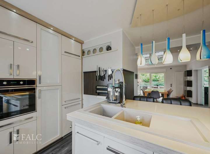 Der offene Küchenbereich ist mit einer hochwertigen Einbauküche ausgestattet und bietet ausreichend Platz für kulinarische Kreationen. Der Essbereich, der nahtlos an die Küche anschließt, lädt zu gemeinsamen Mahlzeiten ein und führt direkt auf eine der Terrassen, die zusätzlichen Raum für Entspannung im Freien bietet.