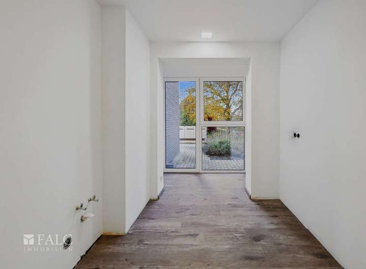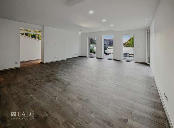 Im Erdgeschoss befindet sich eine 2-Zimmer-Wohnung mit ca. 108 m² Wohnfläche. Ein großes Wohnzimmer mit angrenzender Küche und Terrasse, ein Schlafzimmer mit separatem Ankleidebereich sowie ein modernes Bad mit Dusche und WC runden das Raumangebot ab.
