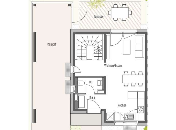 Dieses Haus bietet Platz für die große Familie: Herzstück des Erdgeschosses ist der offen gestaltete Wohn-, Ess- und Kochbereich. Die offene Küche fügt sich harmonisch in den Raum ein – perfekt für gemeinsames Kochen, Familienleben und gesellige Abende. Praktisches Detail: die direkte Verbindung vom Carport ins Haus - ideal (nicht nur) an regnerischen Tagen.