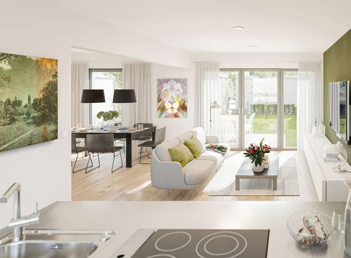 Im Inneren gibt die durchdachte Grundrissplanung auf drei Ebenen jedem Familienmitglied viel Raum für die individuelle Entfaltung. Großzügige Privatgärten sowie abgeschirmte Dachterrassen setzen das faszinierende Wohnerlebnis der eigenen "vier Wände" im Außenbereich fort – Freiheit pur! Besonderes Highlight: im Anschluss an die Gartenhütte befindet sich eine zusätzliche Terrasse als Freisitz, der in der wärmeren Jahreszeit vielfältige Nutzungsmöglichkeiten bietet.