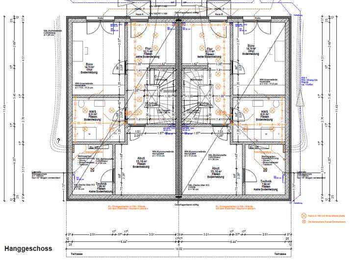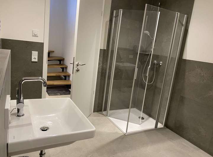 Durch den geräumigen Eingangsbereich gelangen wir direkt in das Hanggeschoss. Dort befindet sich ein Büro, ein Hauswirtschaftsraum/ Badezimmer, der Technikraum sowie ein großer Hobbyraum/ Abstellraum.