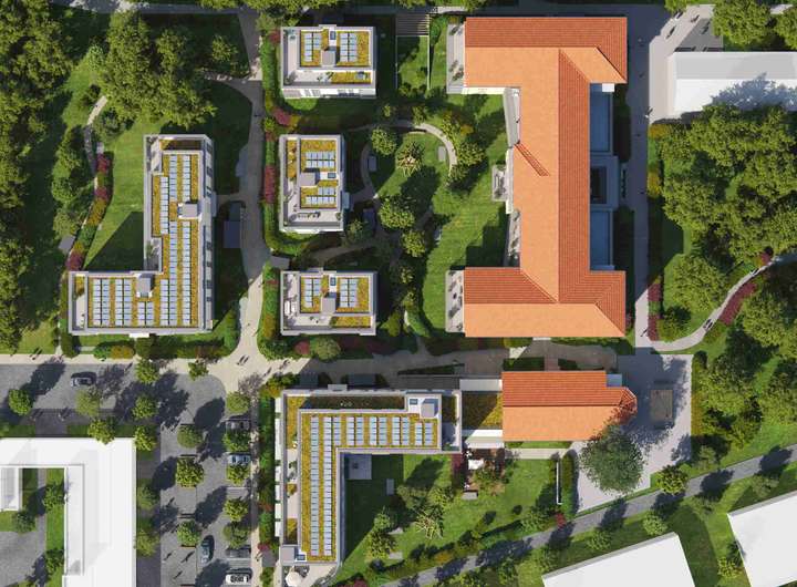 Das Energiekonzept fördert einen umweltbewussten Lebensstil. Es beinhaltet unter anderem Dachflächen mit extensiver Begrünung. Für nachhaltig produzierten Strom sorgen die Photovoltaikanlagen auf allen Dächern. Die kompakten Baukörper garantieren darüber hinaus einen geringeren Energieverbrauch und die wärmegedämmten Fassaden sowie der außenliegende Sonnenschutz ein angenehmes Raumklima.