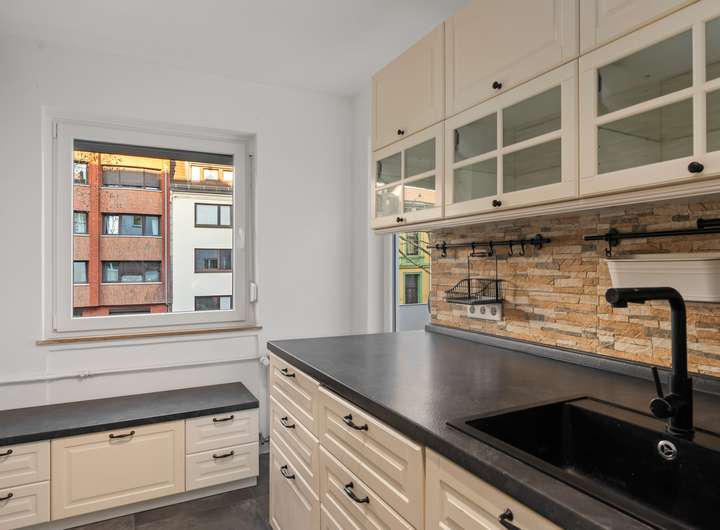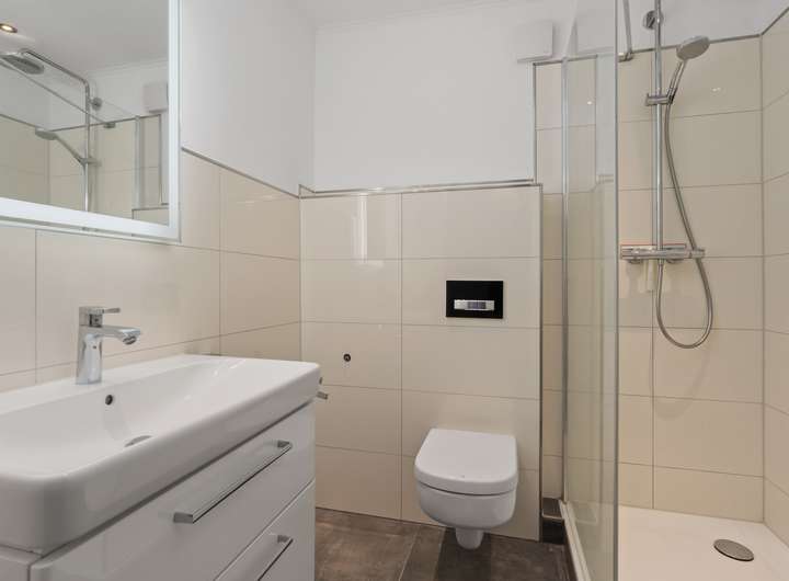 Das moderne Duschbad ist zeitgemäß ausgestattet und fügt sich harmonisch in das Gesamtbild der Wohnung ein. Die Küche stammt aus dem Jahr 2017 und überzeugt durch ihre funktionale und moderne Gestaltung. Auch technisch wurde die Wohnung kontinuierlich modernisiert. Die Gas-Zentralheizung wurde 2016 erneuert, die Elektrik ist dreiadrig ausgeführt und die Türen wurden in den Jahren 2016/2017 ausgetauscht. Besonders hervorzuheben sind die neuen Fenster aus dem Jahr 2025, die sowohl energetisch als auch optisch einen deutlichen Mehrwert bieten. Das Treppenhaus wurde in den Jahren 2019/2020 umfassend saniert und unterstreicht den gepflegten Gesamteindruck des Hauses.