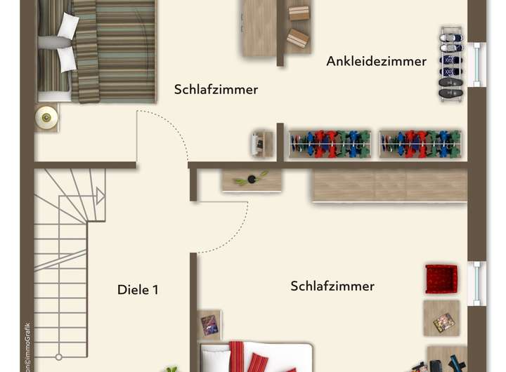 Über die massive Holztreppe gelangen Sie ins Obergeschoss. Hier finden Sie ein Schlafzimmer und ein direkt angrenzenden Ankleidezimmer – ein schönes Detail, das Stauraum schafft.