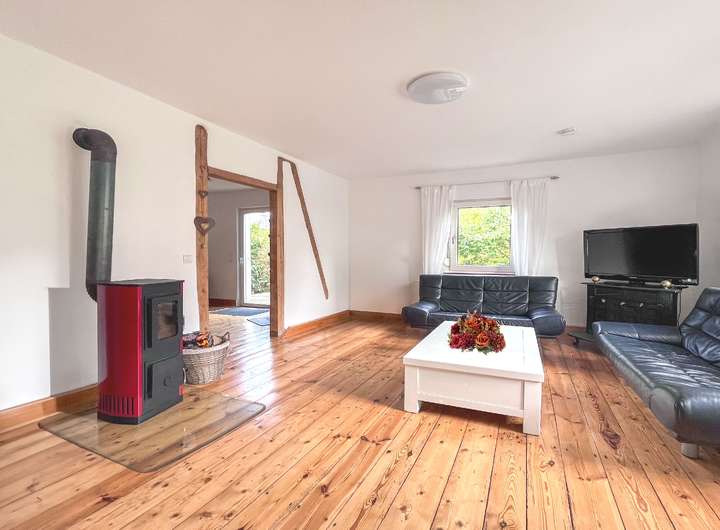 Gehen Sie weiter öffnet sich der zusammenhängende Wohn- und Essbereich mit ca. 30 m² und Gartenzugang. Der Raum ist gemütlich, mit schönem Dielenboden, der im gesamten Haus einheitlich verlegt wurde. Die sichtbaren Holzbalken in den Wänden erzählen die Geschichte des Hauses und verleihen dem Raum eine besondere Atmosphäre.