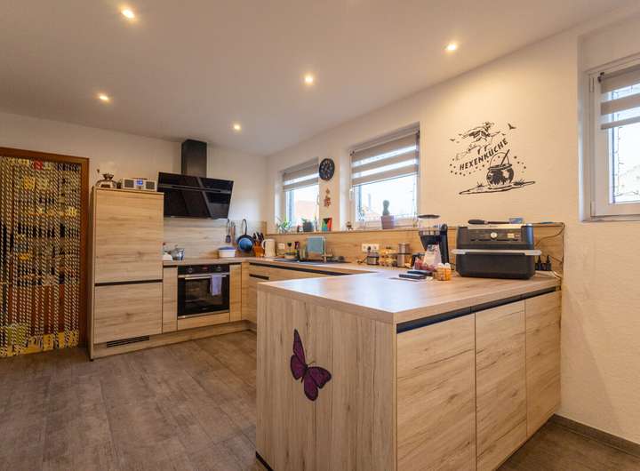 Das Haus verfügt über insgesamt fünf Zimmer, darunter drei gut geschnittene Schlafzimmer. Ein modernes Badezimmer sowie ein separates Gäste-WC sorgen für Alltagstauglichkeit und Komfort. Die moderne Küche fügt sich harmonisch in das Wohnkonzept ein und bietet optimale Voraussetzungen für gemeinsames Kochen und geselliges Beisammensein. Großzügige Fensterflächen schaffen eine helle und freundliche Wohnatmosphäre.