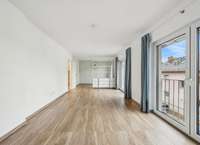 Beim Betreten der Wohnung gelangt man in einen einladenden Dielenbereich, der fließend in die moderne Küche übergeht. Rechterhand befinden sich das Gäste-WC sowie der Zugang zum großzügig geschnittenen Wohn- und Essbereich. Dieser offen gestaltete Raum besticht durch große Fensterflächen und eine angenehme, lichtdurchflutete Atmosphäre.