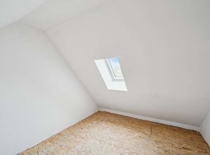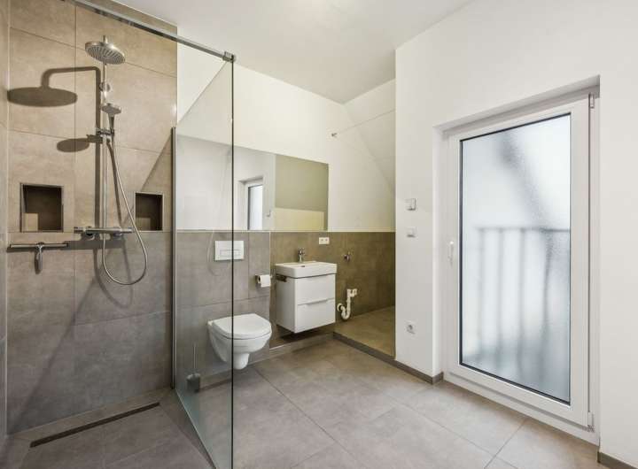 Über eine Treppe im Dielenbereich erreicht man das obere Geschoss der Wohnung. Hier befindet sich das helle Tageslichtbadezimmer, das mit einer bodengleichen, begehbaren Dusche ausgestattet ist. Zudem ist vom Flur aus das Schlafzimmer erreichbar, das dank seiner ruhigen Lage und der großzügigen Fensterfront eine angenehme Wohnatmosphäre bietet. Ein praktischer und heller Speicher ist über eine Deckenluke zugänglich und bietet zusätzliche Fläche.