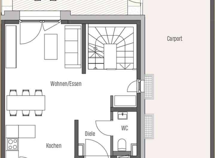 Dieses Haus bietet Platz für die große Familie: Herzstück des Erdgeschosses ist der offen gestaltete Wohn-, Ess- und Kochbereich. Die offene Küche fügt sich harmonisch in den Raum ein – perfekt für gemeinsames Kochen, Familienleben und gesellige Abende. Praktisches Detail: die direkte Verbindung vom Carport ins Haus - ideal (nicht nur) an regnerischen Tagen.