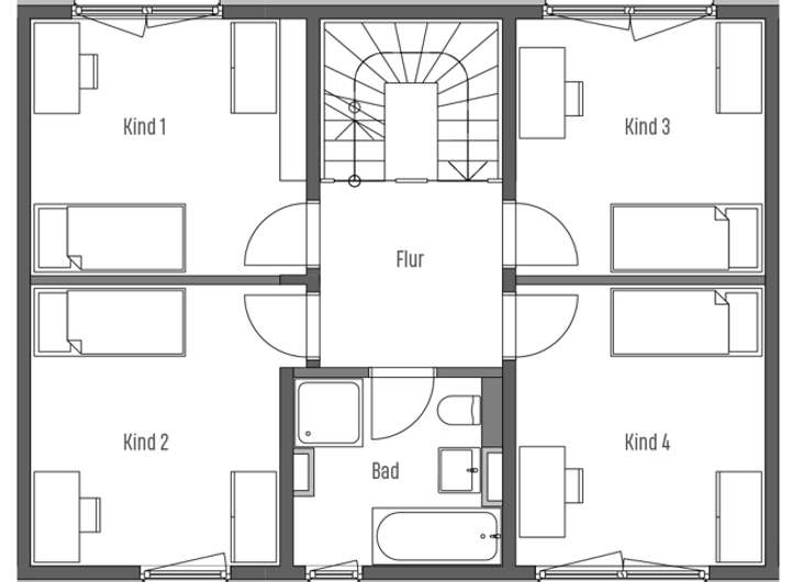 Im Obergeschoss finden vier (Schlaf-)Räume Platz, die aufgrund ihrer Größe sowie des praktischen Zuschnitts flexibel nutzbar sind. Weiterhin befindet sich hier ein attraktives Tageslichtbad mit Badewanne und Dusche.