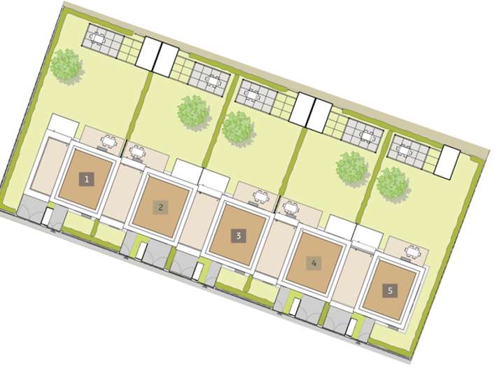 Die beiden Reihenhauszeilen aus jeweils fünf Eigenheimen bilden zusammen das Wohnkonzept »TOP 1O«. Das hier angebotene Haus gehört zur südlichen Reihe der Eigenheime, die den zweiten und letzten Bauabschnitt bildet.
