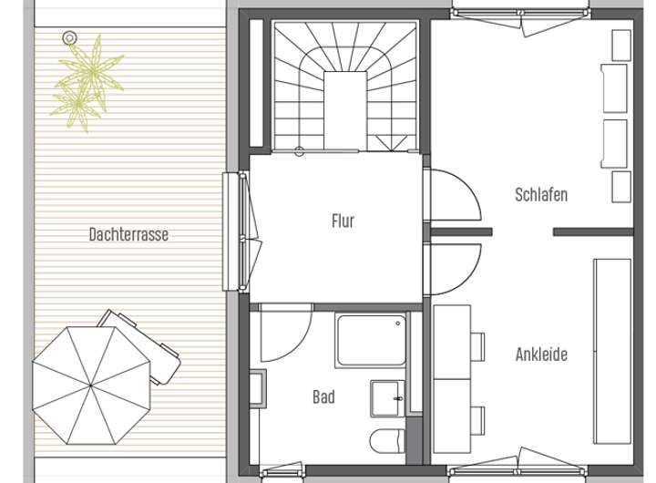 Das vollständig ausgebaute Dachgeschoss bietet Raum für ein weiteres Schlafzimmer mit angeschlossener Ankleide (alternativ auch als weiteres Schlaf-, Gäste oder Arbeitszimmer mit eigenem Zugang vom Flur nutzbar) sowie ein großzügiges Tageslichtbad mit Badewanne. Ergänzt wird der Wohnbereich um eine nach Westen ausgerichtete, ca 22 m² große Dachterrasse.