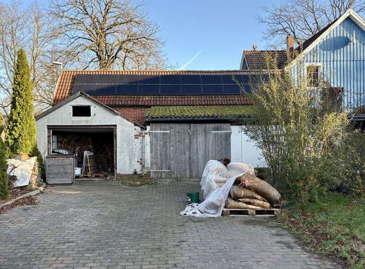 Die vorhandene Garage ist schon etwas in die Jahre gekommen und dient aktuell als Holzlager. Zusätzlich befindet sich ein Stellplatz auf dem Grundstück.