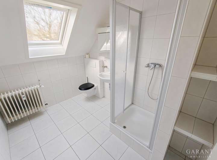 * Badezimmer mit Dusche, Toilette und Waschmaschinenanschluss