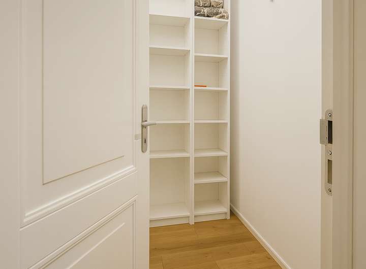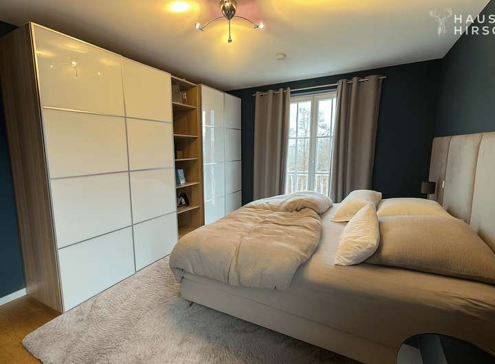 Die lichtdurchfluteten Räume strahlen eine harmonische Atmosphäre aus und laden zum Verweilen ein. Zwei luxuriöse Badezimmer bieten höchsten Komfort und Privatsphäre, während ein begehbarer Kleiderschrank zusätzlichen Stauraum bietet. Das Schlafzimmer mit Samtwandpaneelen bietet einen Rückzugsort mit Blick über die Stadt.