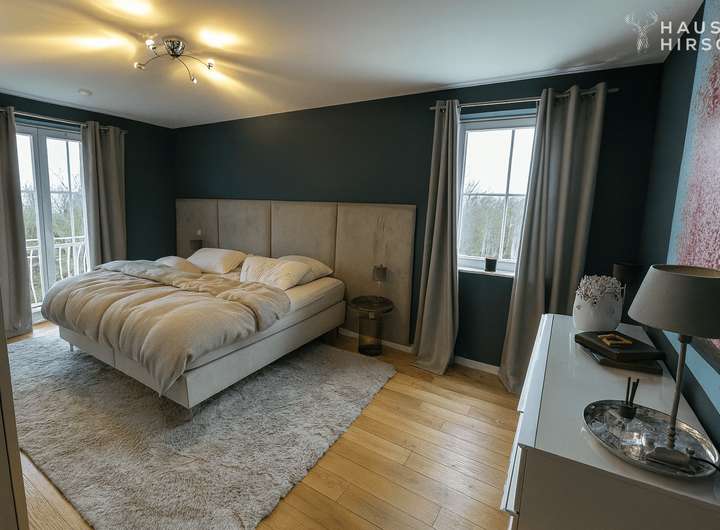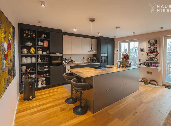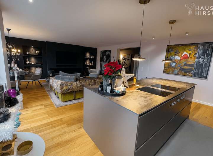 Der großzügige Wohn- und Essbereich beeindruckt mit einem loftartigen Charakter und edlem Echtholzparkett. Die offene Raumgestaltung lädt zu geselligen Abenden und kulinarischen Abenteuern in der exklusiven Warendorf-Küche ein, welche mit elegantem Titan/Oak-Design und modernen Geräten wie Bora begeistert.