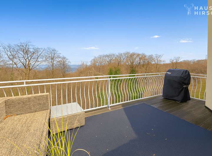 Vom Balkon aus genießen Sie den majestätischen Ausblick über die grüne Parkanlage und das umliegende Wuppertal.