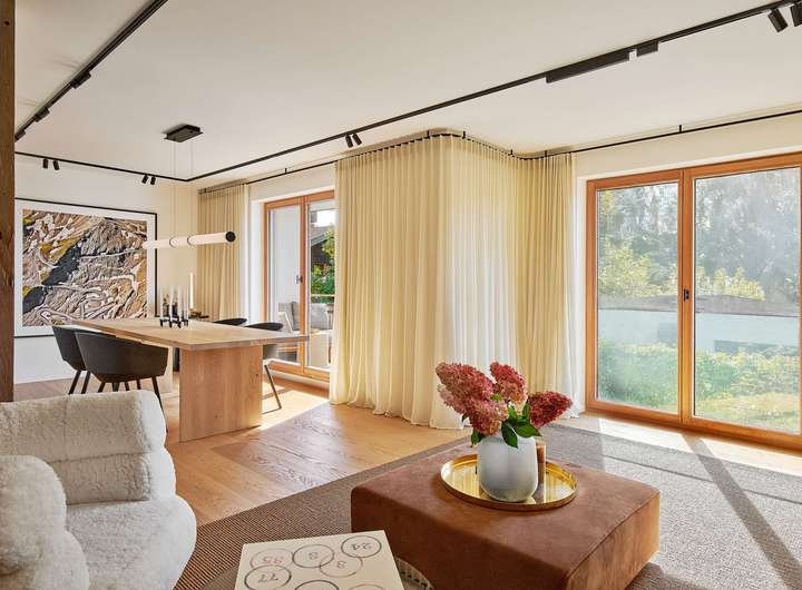 - Deckenmontierte Vorhangschienen (Interstil) samt maßgefertigter Vorhänge