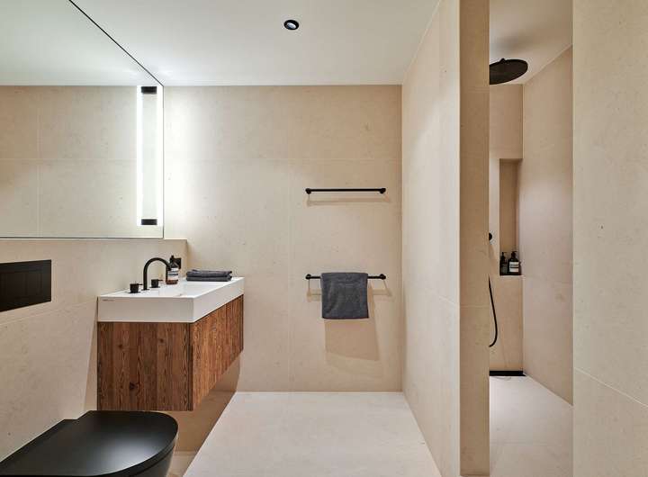- Bad, gestaltet mit großformatigen Limestone-Platten, ausgestattet mit geräumiger Walk-in-Dusche samt Rainshower und Shampoo-Nische, maßgeschreinertem Waschtisch samt Keramikbecken (Laufen) und mattschwarzer Vola-Armatur, großformatigem Wandspiegel samt Beleuchtung (Kaia), mattschwarzem WC (Laufen/Kartell) und Deckenspots
