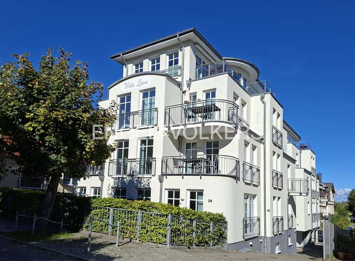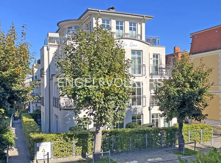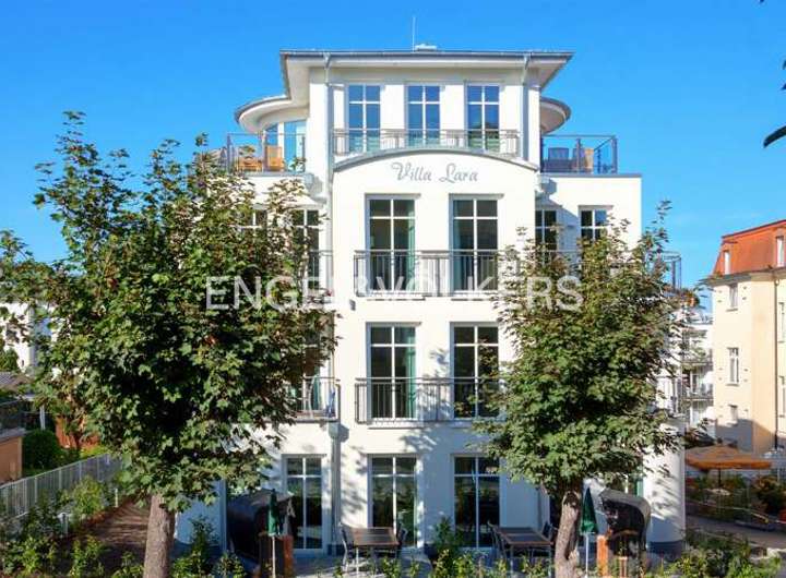 Herzlich Willkommen in der Villa Lara, einer modernen Stadtvilla im Herzen des Seebads Ahlbeck und nur ca. 160 m vom Ostseestrand entfernt. Im 3. Obergeschoss des Hauses gelegen, verfügt Ihr Appartement über einen kombinierten Wohn- und Küchenbereich mit Kamin und Zugang zur umlaufenden Dachterrasse. Hier genießen Sie den Blick auf die Ostsee. Großzügige, teils bodentiefe Fensterfronten sorgen für ein helles, einladendes Ambiente und holen das besondere Licht der Ostsee direkt in Ihren Wohnraum. Ein komfortables Schlafzimmer, das Gäste-WC sowie das Tageslichtbad mit Wanne und ebenerdiger Dusche runden dieses Angebot ab. Im Kaufpreis ist das Inventar bereits enthalten. Ein PKW-Stellplatz in der teilweise überdachten und offenen Tiefgarage ist separat für 12.500 € zu erwerben. Private Abstellbereiche, ein Waschmaschinenraum und eine Fahrradgarage stehen im Untergeschoss des Hauses zur Verfügung. Bitte kontaktieren Sie uns für weitere Informationen und Besichtigungsmöglichkeiten. Wir beraten Sie gern.
