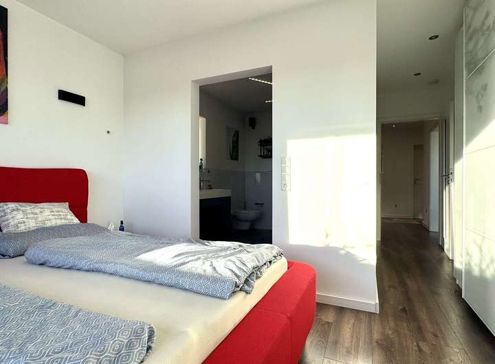 - Schlafzimmer mit Bad en suite: Ruhig gelegenes Schlafzimmer mit angrenzendem Badezimmer ausgestattet mit Badewanne und Fußbodenheizung.