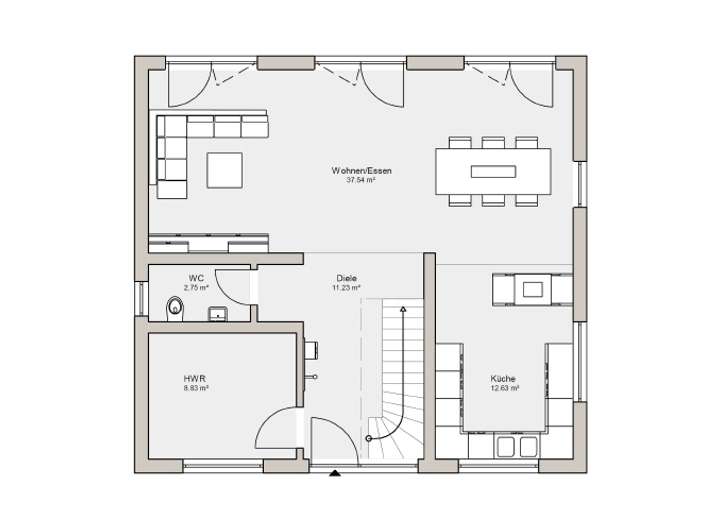 Das Massivhaus Trend ist modern und zeitlos zugleich. Die Architektursprache des Familienhauses ist klassisch, kombiniert mit der modernen Grundrissgestaltung im Innenraum. Das Erdgeschoss folgt dem Trend der Offenheit. Es gleicht mit der Kombination aus Wohnen, Essen und Küche einem Loftcharakter. Im Erdgeschoss befinden sich außerdem der Hauswirtschaftsraum und ein Gäste-WC. Alle Räume sind von der Diele aus erreichbar.