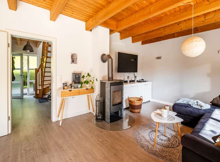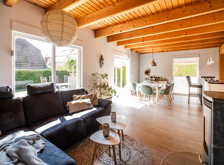 Im großzügigen Wohnzimmer sorgt ein Kaminofen an kühlen Tagen für wohlige Gemütlichkeit und eine angenehme Atmosphäre. Die Bäder wurden erst vor kurzem modernisiert und präsentieren sich in zeitgemäßem Design.