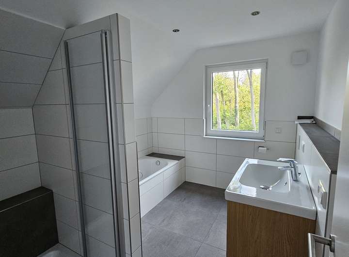Baujahr 1977; neu gefliester Erdgeschossflur mit Fußbodenheizung und Garderobenplatz; neu gefliestes Gäste-WC mit Fußbodenheizung und Fenster; Küche mit Fußbodenheizung und neuer Einbauküche (Geschirrspüler, Induktionskochfeldern etc.); großer, neu gefliester Essbereich (ca. 15 m²) mit Fußbodenheizung; großer Wohnbereich (ca. 30 m²) mit Terrassenausgang, Fußbodenheizung Vinylfußboden sowie TV- und LAN-Anschluss; große Süd-/West-Terrasse mit elektrischer Markise, Abstellraum und Sichtschutz; ca. 180 m² großes und angelegtes Grundstück; Holztreppe zum Dachgeschoss; Dachgeschossflur mit Vinylfußboden; großes Schlafzimmer (ca. 18 m²) mit Vinylfußboden, elektrischen Außenrollläden sowie TV- und LAN-Anschluss; neues Badezimmer mit Badewanne, Dusche inkl. Duschkabine, Fußbodenerwärmung, Handtuchheizung und Fenster; großes großes Kinderzimmer I (ca. 23 m²) mit Vinylfußboden, elektrischen Außenrollläden sowie TV- und LAN-Anschluss; großes Kinderzimmer II (ca. 20 m²) mit Vinylfußboden, elektrischen Außenrollläden sowie TV- und LAN-Anschluss; Abstellfläche auf dem Kriechboden; weiße Innentüren; Kunststofffenster; Gasheizung mit Warmwasseraufbereitung; Carport-Stellplatz € 40,00/monatlich und Pkw-Stellplatz; Kabelfernsehen möglich.